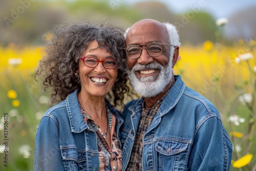 Portrait of a happy multicultural couple in their 60s sporting a rugged denim jacket on bright spring meadow