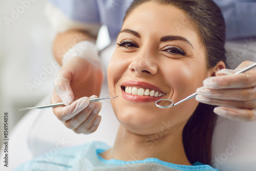 Portrait of a happy patient during a visit to the dentist. The doctor is checking teeth using a dental instrument, ensuring proper oral care and thorough examination in the dentistry clinic.