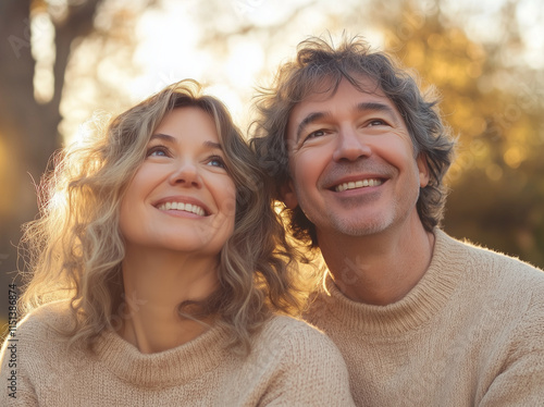 Portrait of a happy senior couple in a park. A beautiful middle-aged woman and man are smiling, looking up at the sky with love