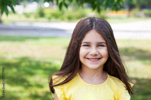 Portrait of a happy smiling child girl outdoors. Cute little girl playing in the park.