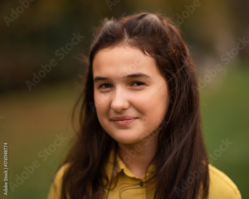 Portrait of a happy teenage girl in the autumn park, looking at the camera and smiling.