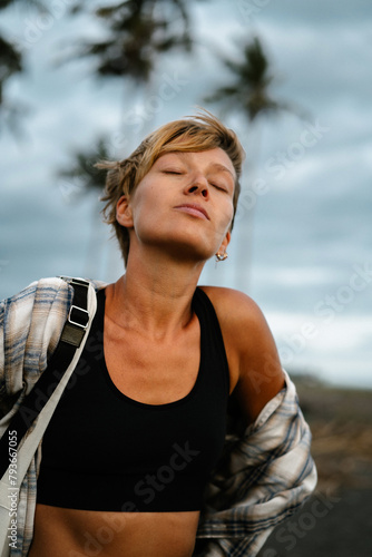 woman, short hair, closeup, portrait, summer, sensuality, tropical, vacation, sky, bali, sunlight, nature, lifestyle, avocation, front view, femininity, beauty, blonde hair, confidence, sea, travel, tour tourism, enjoyment, seductive woman, freedom, us, california, female, outdoors, day, head shot, one person, young adult, missy, palm, indonesia, white