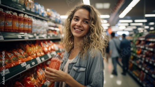 adult, aisle, attractive, beautiful, beverage, blond, bottle, buying, caucasian, checkout, consumer, curly hair, client, drink, female, food, grocery, happiness, healthy, holding, juice, market, people, person, portrait, purchase, retail, shelf, shopping, smile, smiling, store, supermarket, woman, young