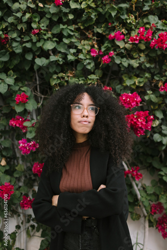 attitude, black hair, brunette, casual attire, closeup, confident, curly, expressive, eyeglass, face, flower, goggles, hair, coiffure, happy, head, hispanic, latin, latina, laughing, lifestyle, photo, plant, portrait, real people, smile, street, trendy