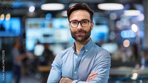 Portrait of a Journalist in a Blurred Newsroom Background, Portrait Shot, Journalist, Newsroom Background