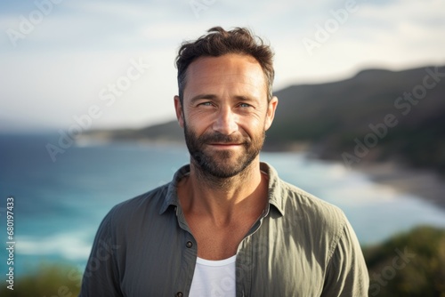 Portrait of a jovial man in his 40s wearing a simple cotton shirt against a serene seaside background. AI Generation