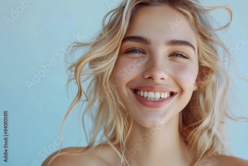 Portrait of a joyful, blonde woman with healthy hair on a grey studio background. Salon, grin, and face of lovely young model with clean hair from hairdresser