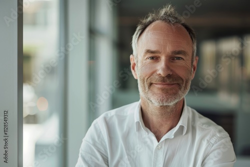 Portrait of a joyful man in his 50s wearing a simple cotton shirt on sophisticated corporate office background