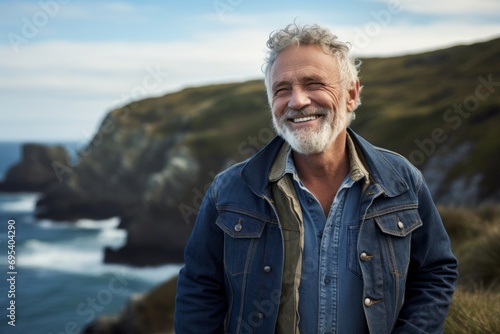 Portrait of a joyful man in his 60s sporting a rugged denim jacket against a rocky shoreline background. AI Generation