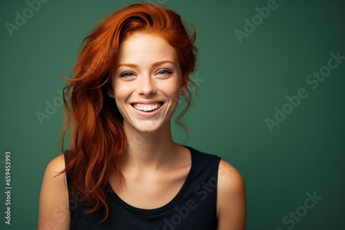 Portrait of a joyful redhead model lady wearing casual blank clothes and smiling. Isolated on a plain colored background. Generative AI.