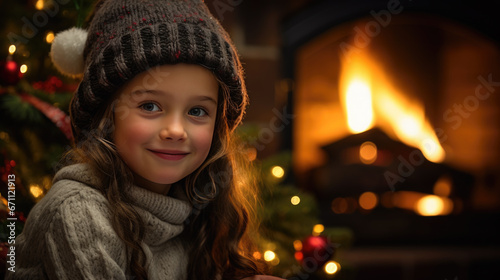 Portrait of a little girl smiling in front of a decorated Christmas tree at home