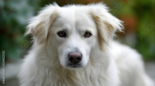 Portrait of a magnificent white fluffy dog looking directly into the camera with focused eyes