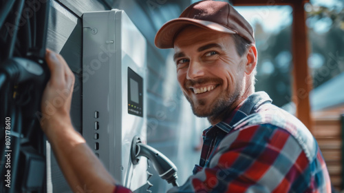 Portrait of a male electrician. A man in a vest is smiling and holding a hose. He is standing next to a white power station