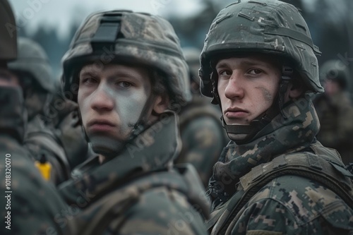 portrait of a male soldier in military uniform with a helmet against the background other soldiers standing in the background
