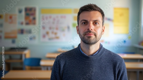 teacher, classroom, education, male, portrait, modern, learning, setting, student, cognition, instructor, academic, serious, professional, teaching, school, background, empty, desk, cv, youthful, confident, educator, career, scholar, workshop, environment, leadership, training, motivational, innovative, communication, discipline, engagement, interaction