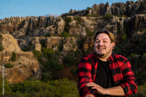 Portrait of a man sitting on the mountain, Cerro del Hierro. Spain.