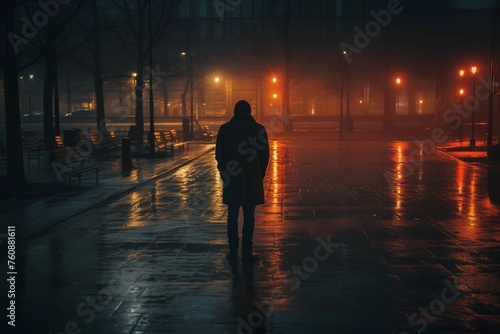 portrait of a man viewed from the back. loneliness in the city, a lonely man, a guy among home and people sitting on a bench in the rain. lonely life, ascetic, wisdom, depression, difficult life stage