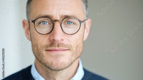 Portrait of a man wearing eyeglasses, showcasing a thoughtful expression, set against a minimalist background, emphasizing his features and style.