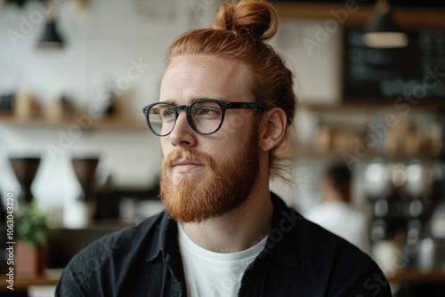 Portrait of a man with black glasses, ginger hair in a bun and beard, wearing a black shirt