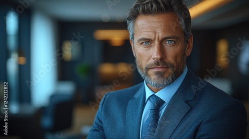 man, portrait, suit, attaching, blue, graying, hair, indoor, office, formal, professional, attire, businessman, executive, leader, confidence, mature, sophisticated, elegant, stylish, smart, photogenic, corporate, head shot, gaze, serious, facial, expression, adult, looking, camera, clothing, fashion, workplace, interior, background, light, blurred, studio, closeup, front, view