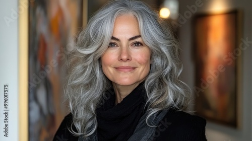 mature woman, woman, female, portrait, grey hair, grey hair, white hair, elderly, senior, ageing, graceful, beautiful, smile, happy, confident, elegant, style, fashion, clothing, foulard, warm, friendly, approachable, natural, real, genuine, art gallery, art, wall, painting