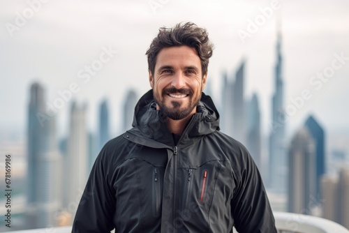 Portrait of a merry man in his 30s wearing a windproof softshell against a stunning skyscraper skyline. AI Generation
