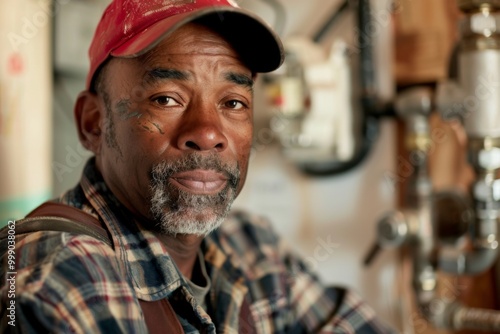 people, male, middle-aged, african american, plumber, portrait, professional, occupation, work, man, tool, service, maintenance, repair, job, utility, blue-collar, technical, expertise, plumbing, equipment, installation, fixing, dependability, home improvement, manual labor, pipe, wrench, craftsmanship, indoor, leak, repairman, technician, household, efficiency, problem solving, dependable, safety-gear, craft, lifestyle, copy space