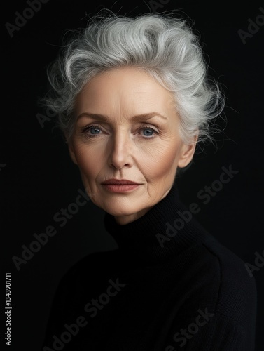 portrait, woman, short, white, hair, wearing, black, turtleneck, sweater, looking, camera, expression, background, completely, making, focal, lighting, natural, highlighting, feature, styled, curly, bob, bang, framing, face, slimmer, smile, lip, eye, photo, art