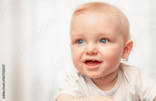 Portrait of a one-year-old baby smiling and looking away