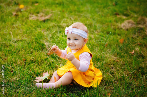 Portrait of a one-year-old smiling girl in a yellow dress sitting barefoot on a lawn against a background of green grass.