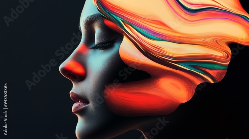 Portrait of a person with a double exposure effect, merging their face with a kaleidoscope of vivid, swirling colors, creating an abstract visual