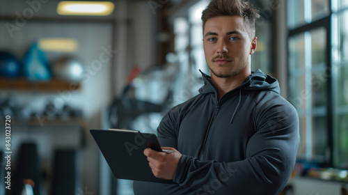 gym, sport, fit, fitness, man, photogenic, physical exercise, trainer, notebook, healthy, exercise, person, dumbbell, sport, young men, guy, working, smiling, smile, looking, man, casual attire, 1, lifestyle, face, people