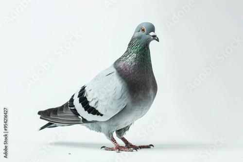 Portrait of a pigeon with grey feathers on a white background, standing in profile.
