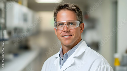 Portrait of a professional scientist in a modern laboratory, wearing a lab coat and safety goggles