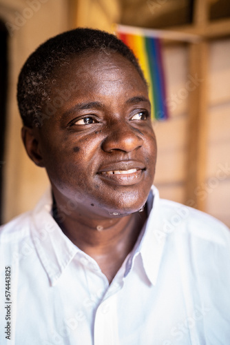 queer, androgynous, masculine, woman, hoyden, black, portrait, pride, rainbow flag, smiling, african, adult, short hair, standing, masculinity, 1, nigeria