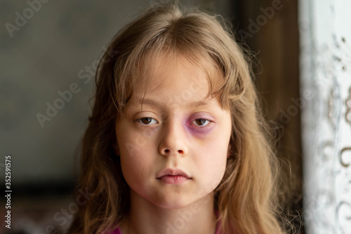 Portrait of a sad and scared little girl with beating. Child domestic abuse.