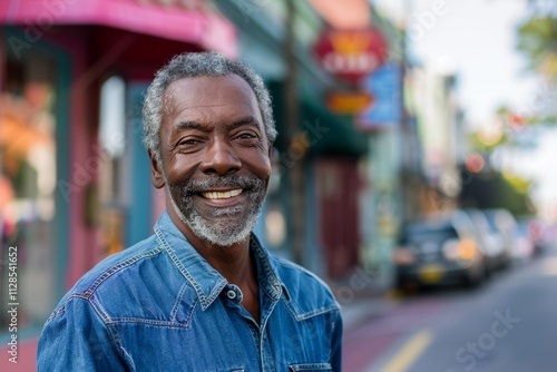 Portrait of a satisfied afro-american man in his 60s sporting a versatile denim shirt on vibrant market street background