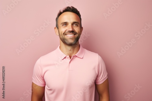 Portrait of a satisfied man in his 30s wearing a sporty polo shirt against a solid pastel color wall. AI Generation