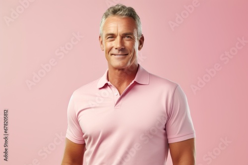Portrait of a satisfied man in his 50s donning a classy polo shirt against a pastel or soft colors background. AI Generation