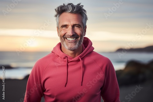 Portrait of a satisfied man in his 50s wearing a thermal fleece pullover isolated on vibrant beach sunset background