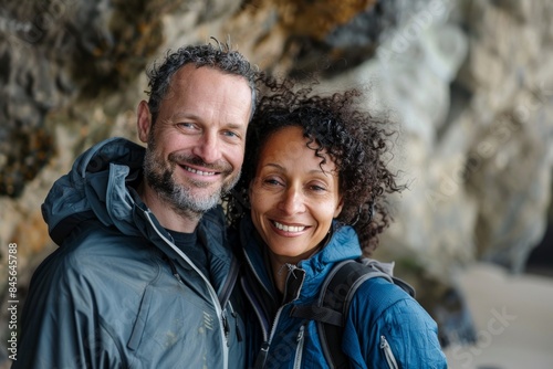 Portrait of a satisfied mixed race couple in their 40s wearing a lightweight packable anorak isolated in spectacular sea cave background