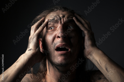 man, unclean, fear, smeared, cry, despair, depression, dirty, anxiety, eye, face, hair, homeless, adult, horror, dark, shadow, male, soot, mud, skin, negative, panic, people, poor, portrait, sad, soiled, grieved, studio, unhappy, victim, worried, young