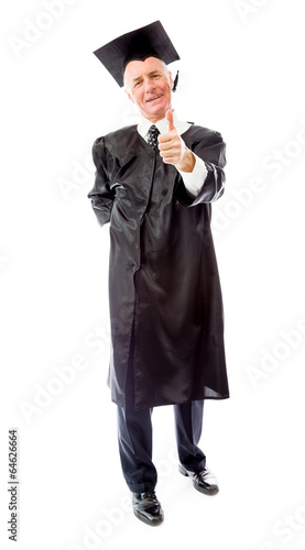 mortarboard, education, confidence, happiness, vertical, studio shot, senior citizen, achievement, success, communication, facial expression, white background, optimism, learning, college students, toothy smile, tassel, approval, one person, standing, human hand, gesticulate, smiling, one man only, content, satisfaction, graduation, photo, thumb up, showing, color image, full-length, cut-out, front view, caucasian appearance