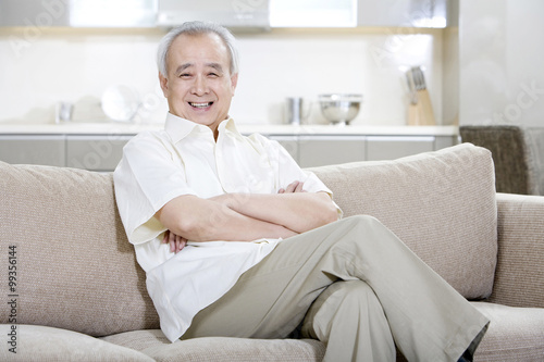 chinese, home, man, arms crossed, white, domestic life, living room, sofa, kitchen, asia, china, east asia, day, indoor, beijing, people, one person, male, 60s, asian ethnicity, retirement, young at heart, lifestyle, smiling, toothy smile, cheerful, front view, portrait, adults only, photo, color image, horizontal