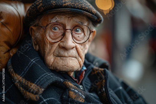 Portrait of a senior man with glasses and cap looking contemplative in a draped plaid, representing resilience and life stories
