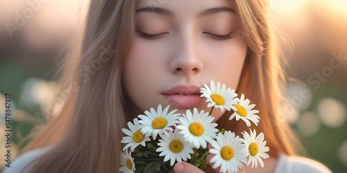 Portrait of a serene young woman with closed eyes surrounded by blooming chamomile flowers in soft sunlight, evoking beauty, peace, and connection with nature in springtime