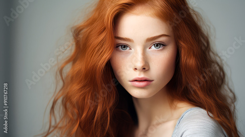 Portrait of a serious aggressive teenage girl with red long hair with perfect skin, silver background, banner.
