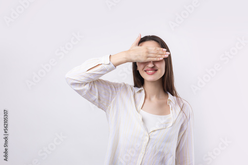 Portrait of a serious young woman showing stop gesture with her palm over white background