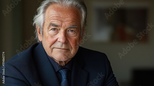 man, senior, elderly, old, male, person, face, portrait, head, shoulder, expression, serious, looking, contemplative, thoughtful, pensive, mature, aged, adult, grey, hair, eye, wrinkle, skin, suit, jacket, attaching, business, professional, executive, leader, authority, wisdom, life events, confident, dignified, respectable, intense, gaze, closeup, indoor, background, blurred