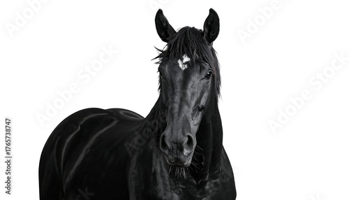 Portrait of a shiny black horse with a white star on its forehead, isolated against a white background